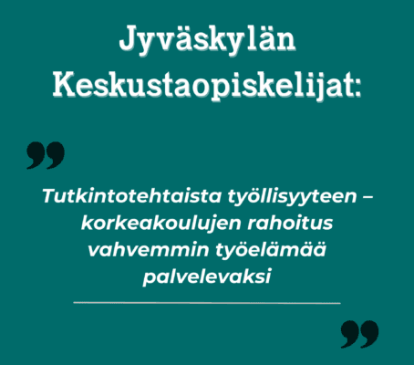 Jyväskylän Keskustaopiskelijat vaatii, että Suomen korkeakoulujen rahoitusmallia on kehitettävä vastaamaan vahvemmin työllisyyttä edistäväksi. Tämä edellyttää, että valmistuneiden työllistymisen painoarvoa lisätään tulosindikaattoreihin perustuvassa rahoituksessa. Rahoitusmallin uudistamisesta hyötyy niin työelämään tähyävä opiskelija, työnantajasektori, kuin laajemmin koko yhteiskunta.